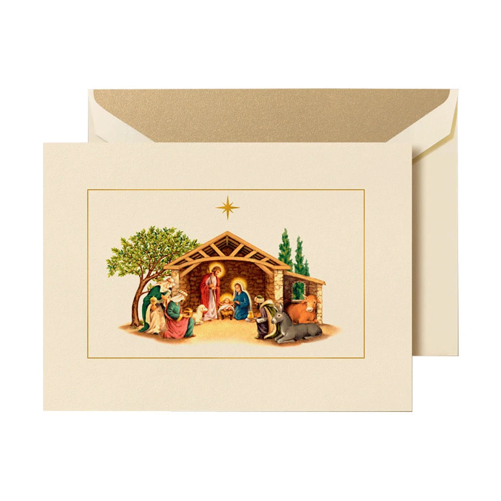 The story of Christmas is celebrated on this holiday card, which features a beautiful depiction of the iconic manger scene. A lovely reminder of why this is truly the most wonderful time of the year. The matching envelope is lined in gold.