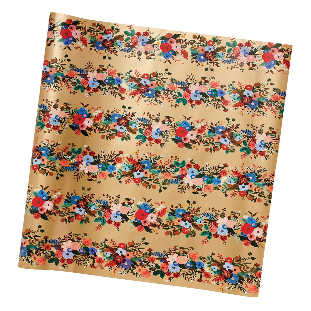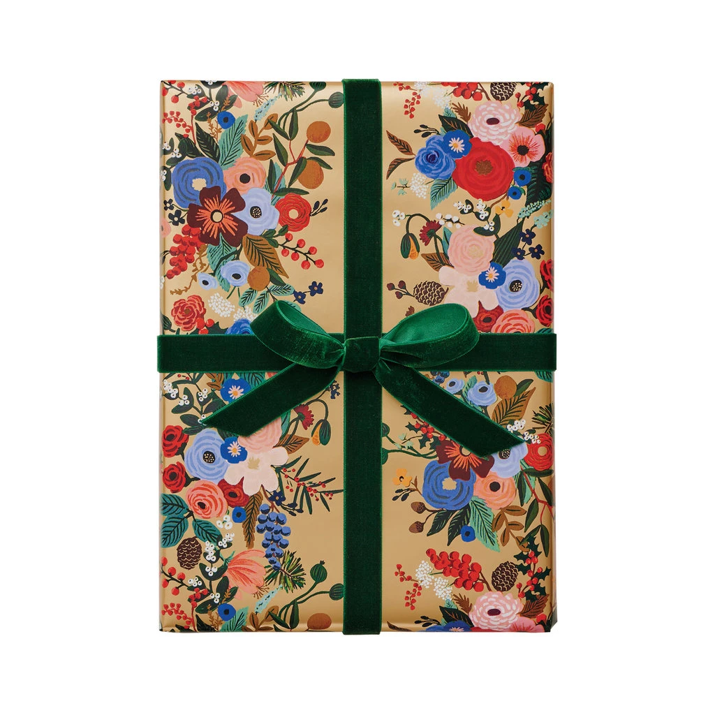 Dress up holiday presents and projects with Rifle Paper Co.’s new wrapping rolls, which feature eight feet of paper with colorful illustrations, gold foil accents, and gridlines on the back.