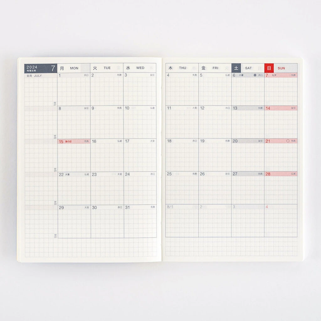 The Day-Free Original Size is an A6 size monthly techo that is split into two main parts: monthly calendars and a graph-paper notebook. The book fits nicely into covers designed for the standard Hobonichi Techo Original.