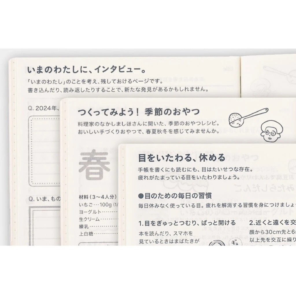 Other than the monthly calendars and the notebook section, the book contains several sections that are great for schedule management, such as a yearly calendar and a yearly index page. The back of the book has bonus pages, including An Interview with Myself, Seasonal Sweets to Make at Home, and Caring for Your Eyes.