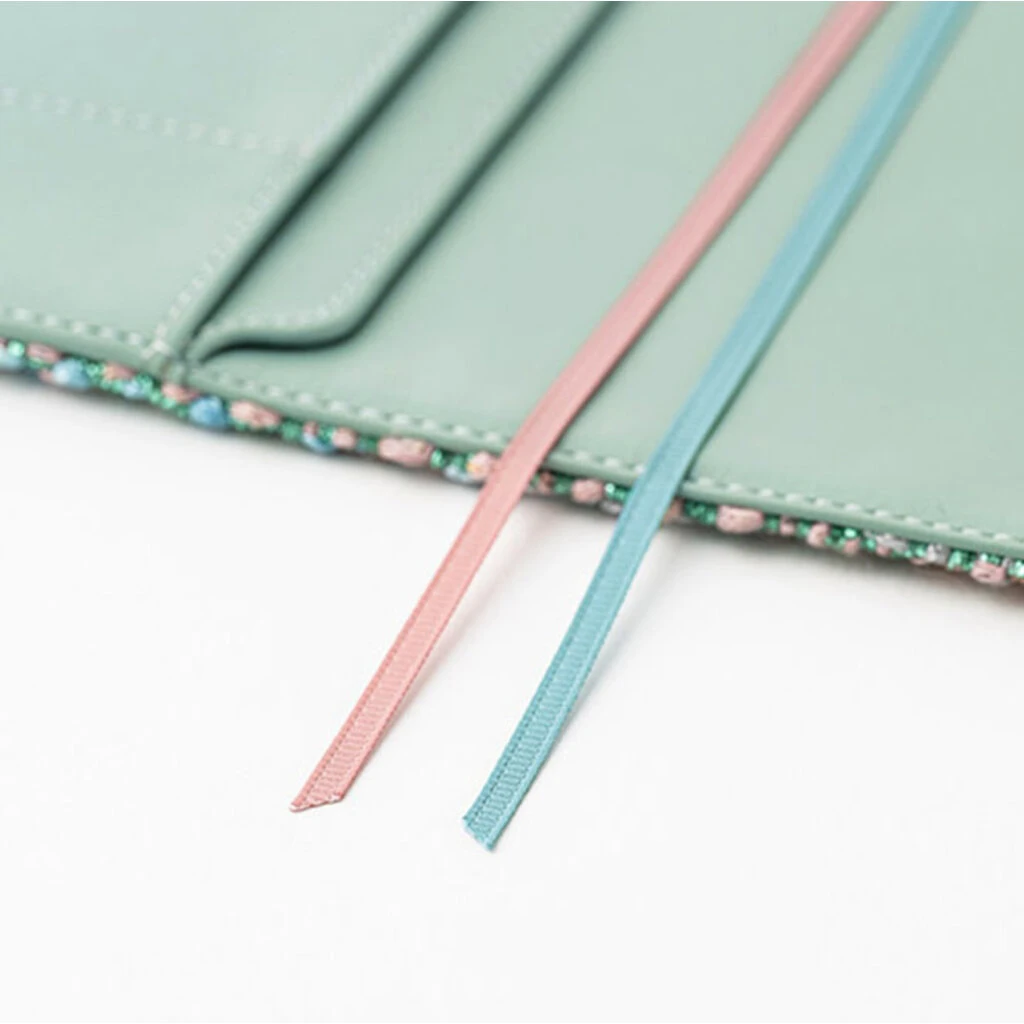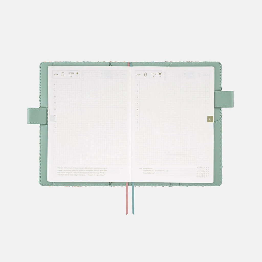 The inner cover and the “butterfly-stopper” pen holders are made of leather for long-lasting use. The smoky green leather will soothe your mind whenever you open your techo.