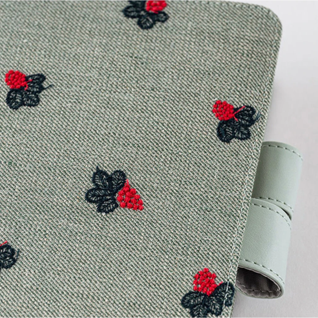 The material comes in green cotton linen with a gentle touch. It is embroidered with pretty berry embroidery in red and navy threads.