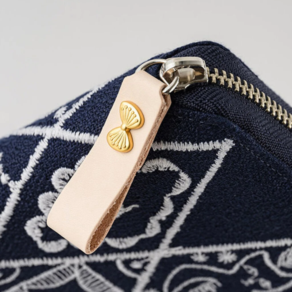 The gray beige of the cover interior has a calming feel to it. The cover includes two bookmarks, one a bright cream yellow and the other light blue. The zipper pull is made from natural leather and includes a cute butterfly charm as an accent.