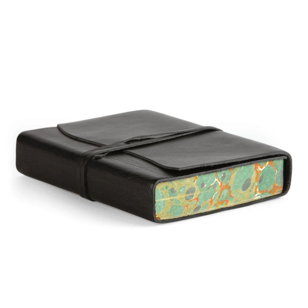 Roma Lussa black leather journal with beautifully marbled edges, and a leather thong that wraps journal flap to secure it closed. This is a thick journal- a commitment for some of us, but a welcome receptacle for those whose writing flows.