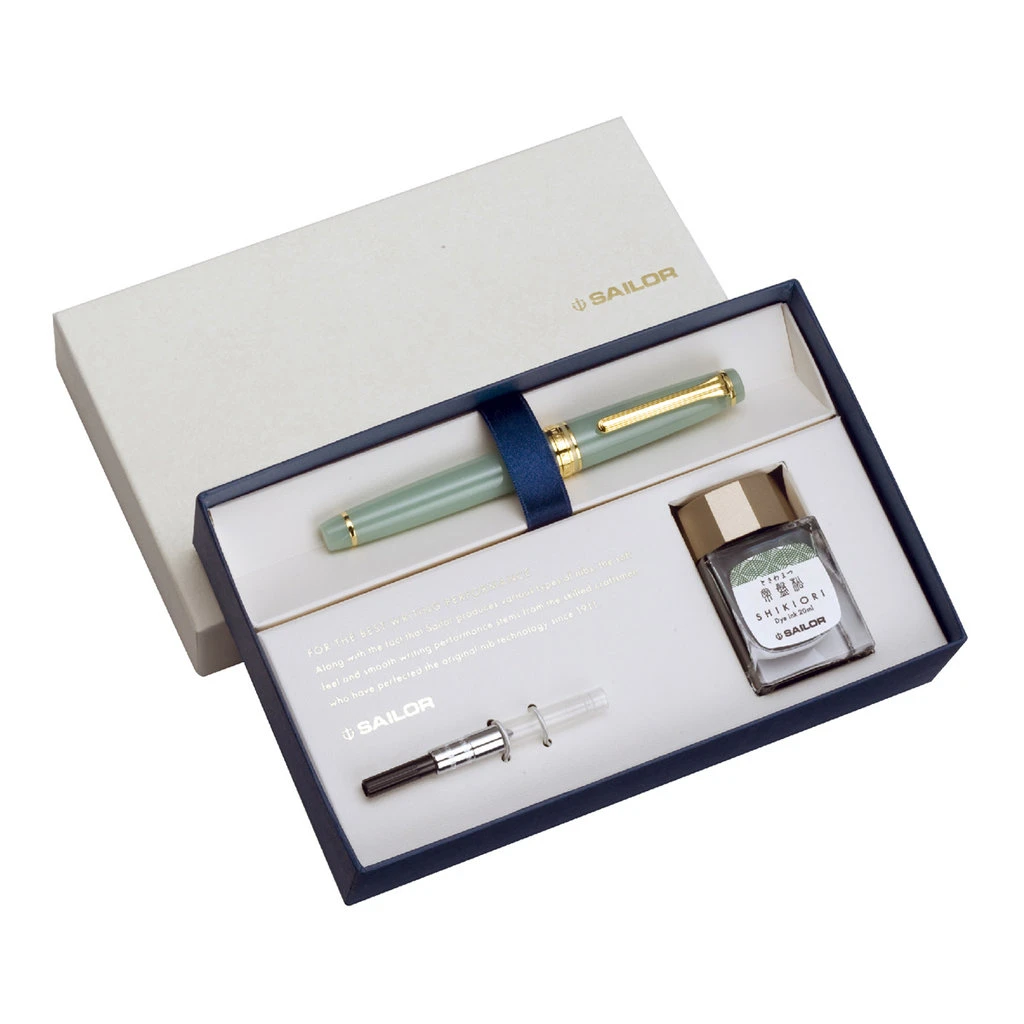 Each pen in the Seasonal Festival Series by Sailor is presented as an elegant set that is carefully packaged to include a matching color ink from the Sailor Shikiori (4 Seasons) Ink series and a converter. All fountain pens in this series are available with a 14K gold nib and with gold trims.