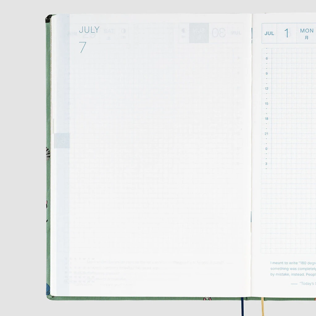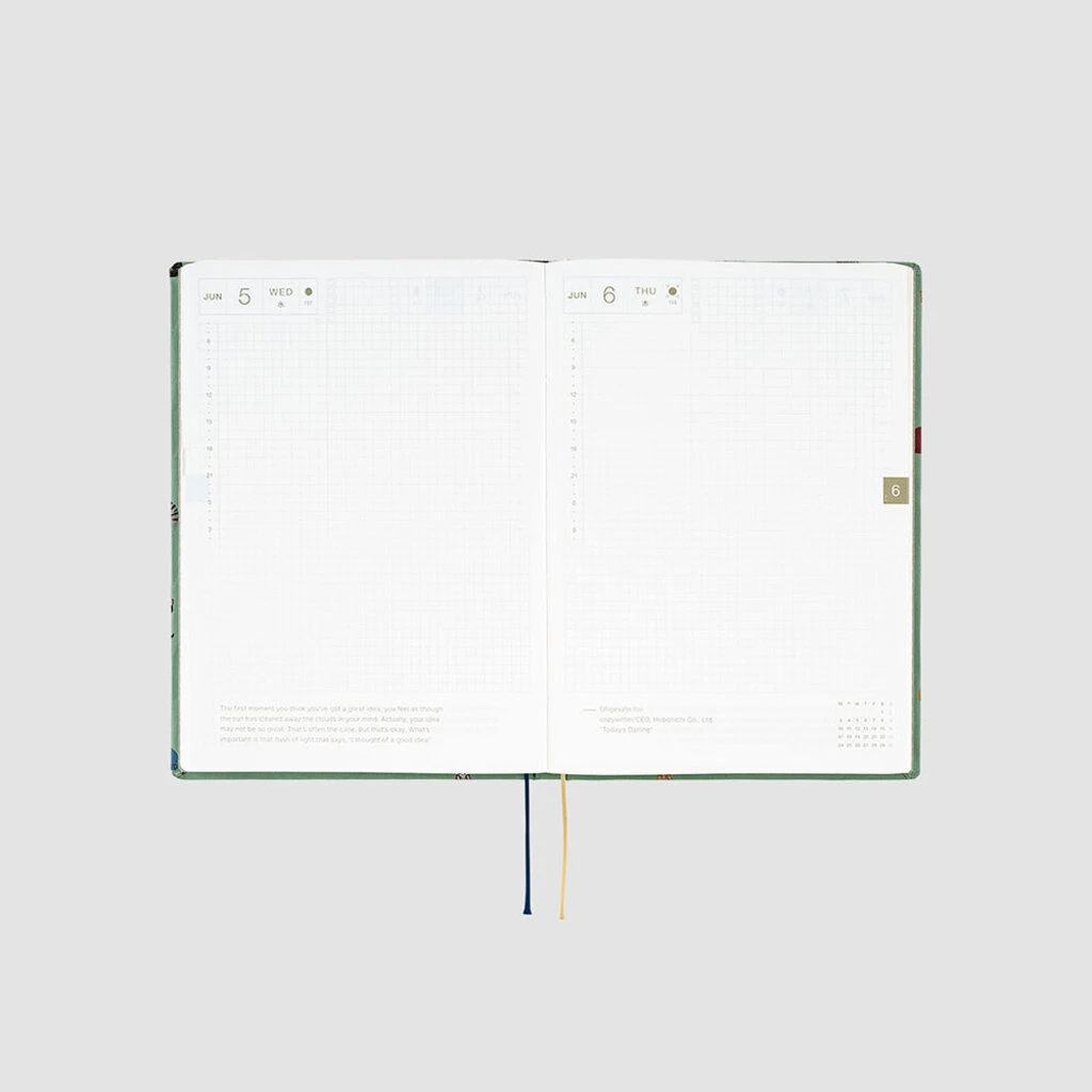The Hobonichi Techo HON has a hardcover design already attached to the book. It’s designed to make you feel like you’re carrying around a favorite book, which you can pull out at any time to make notes no matter where you are. The book has A5 size pages with plenty of space to write and paste, and features a page per day, so the contents are the same as the Hobonichi Techo Cousin.