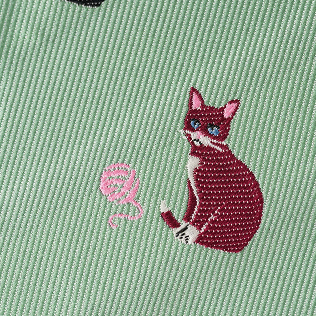 This design features cats that are sitting down and looking steadily this way on a pale, mint green base. Various cats have been expressed in detail through the weaves of the necktie material.