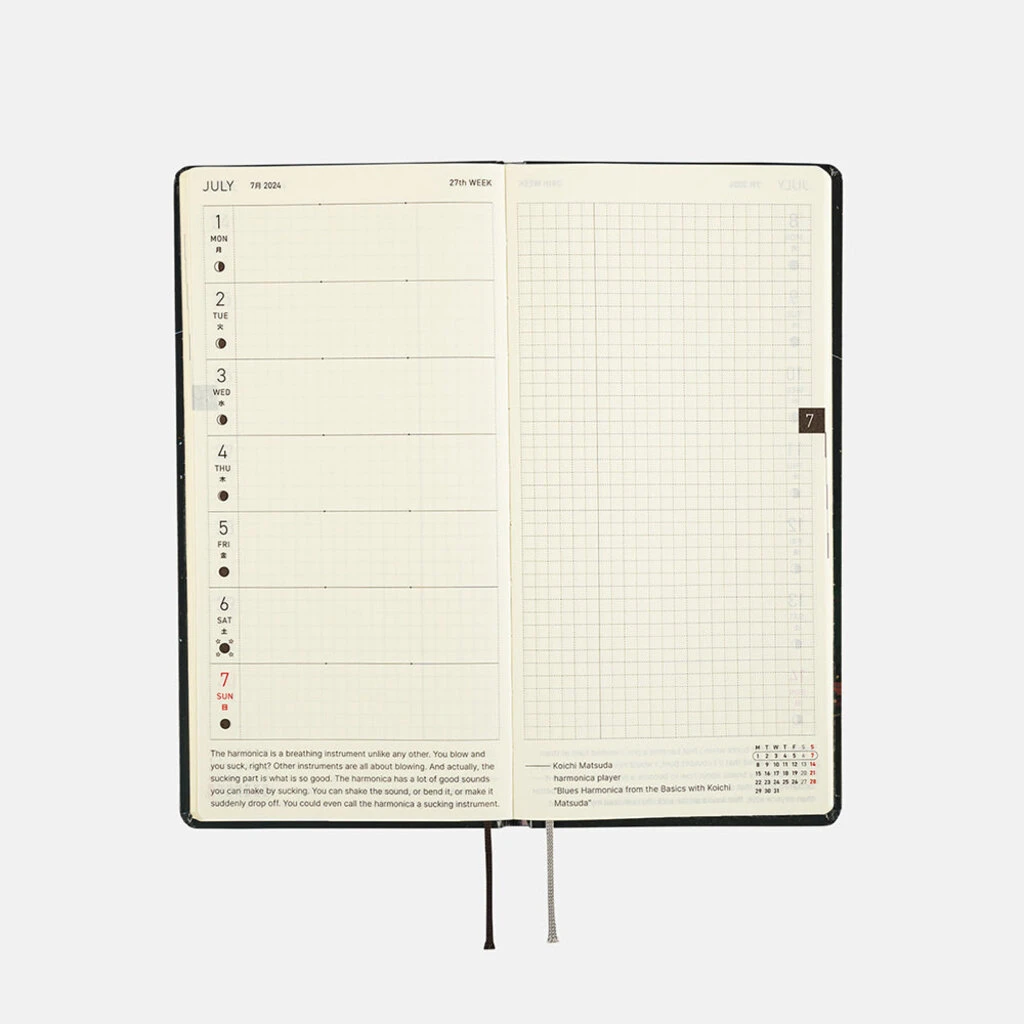 The Weeks book has space for writing in plans or journal entries, and it also has 69 pages of grid paper memo pages in the back (73 pages in the English edition Weeks). The back of the book contains informational pages, including An Interview with Myself and Seasonal Sweets to Make at Home.