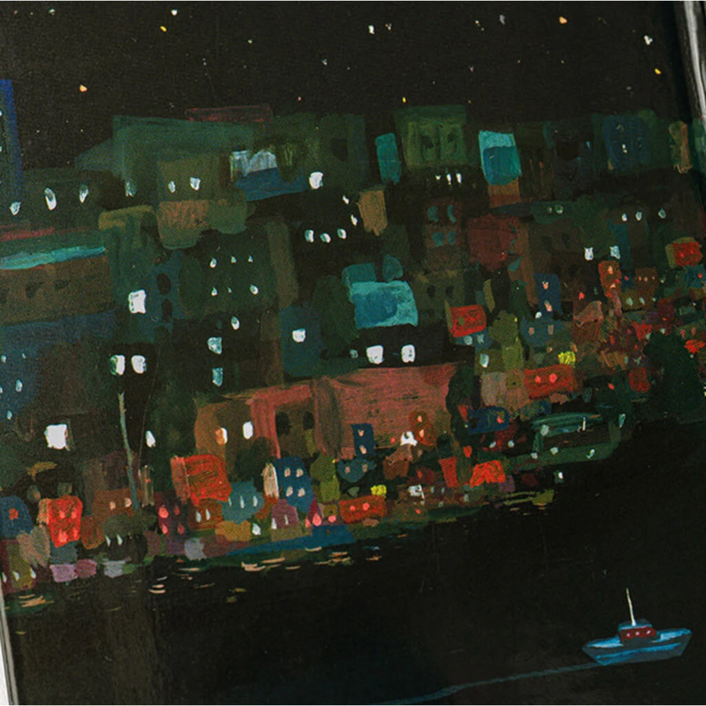 The illustration in the sky is the first to capture your gaze, but the townscape of the people living there is also charming. The nighttime seaside scene feels both lonely and warm.