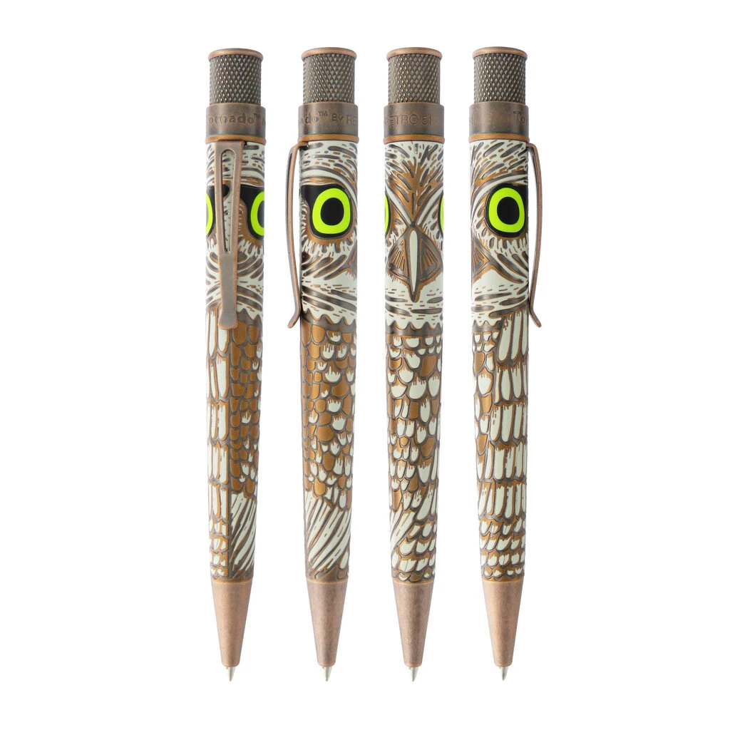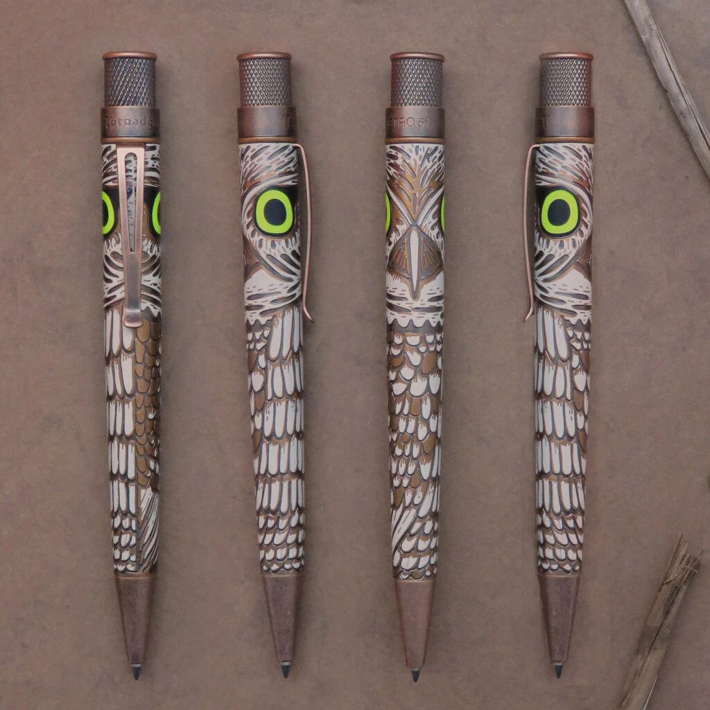 Retro is excited to add the Owl Rescue to this Rescue collection! This Tornado Ballpoint features the image of a burrowing owl through a multi-step process. First the barrel has been acid-etched, followed by a copper plated finish, and finally it’s printed with feathers and glow-in-the-dark eyes.