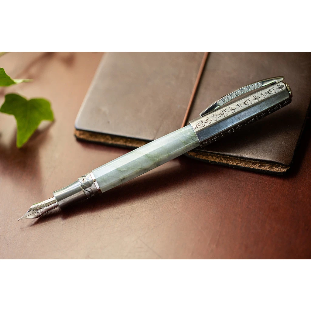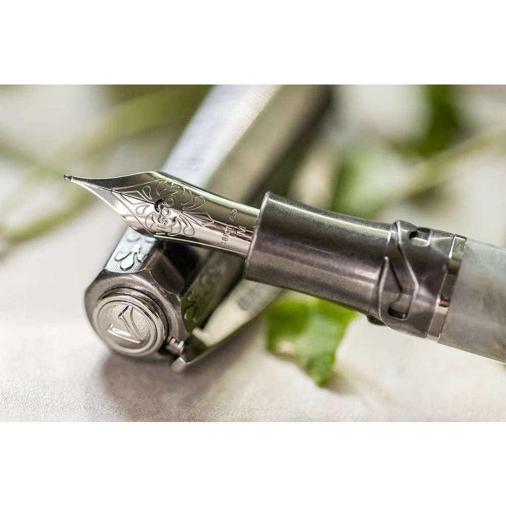 The fountain pen features Visconti’s in-house 18kt white gold nib, available in EF, F, M, B, and Stub widths.